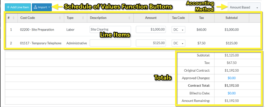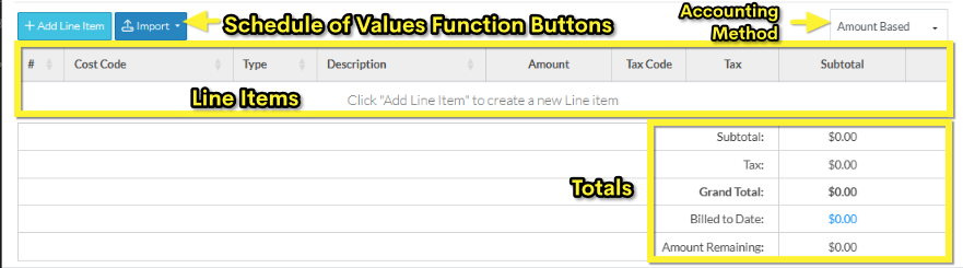 The Schedule of Values component is a list of all the Line Items and the summary and totals section. It is where