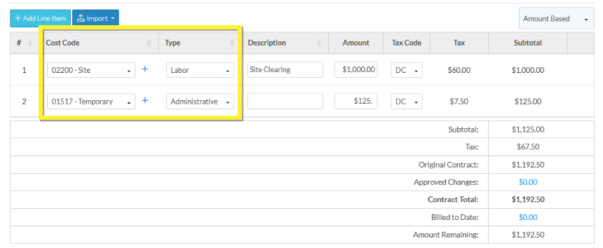 The Cost Code and Cost Type for a Line Item (and Sub Jobs if turned on) can be edited, but only until the form is saved. In the example below, the form has not been saved so the Cost Code and Cost Type (and the Sub Job if applicable) are still drop down fields that can be clicked and changed.
