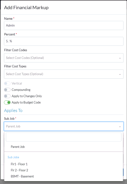 If Sub Jobs are turned on for the project, the Parent/Sub Job must be selected before the Cost Code is selected. See Financial Markup - Applies to Parent/Sub Job.