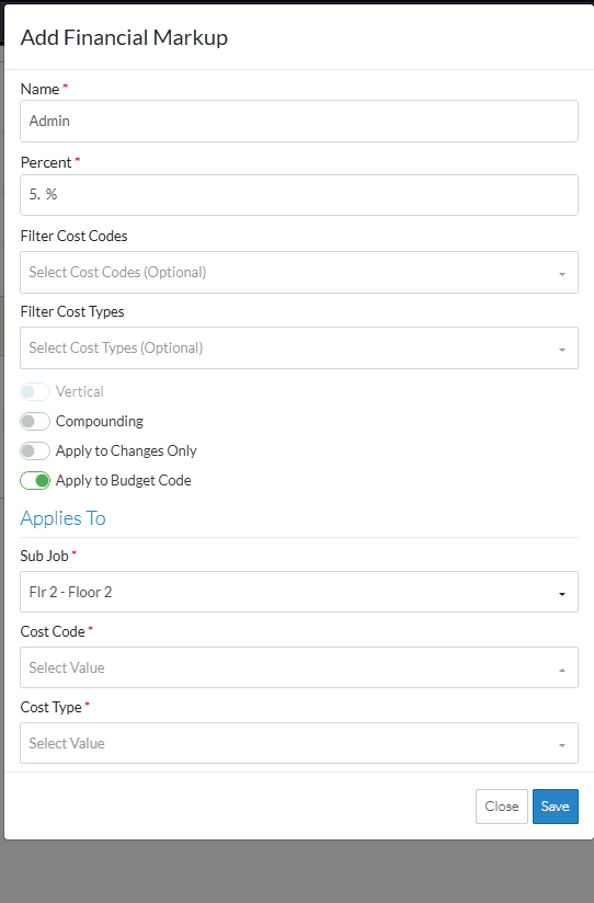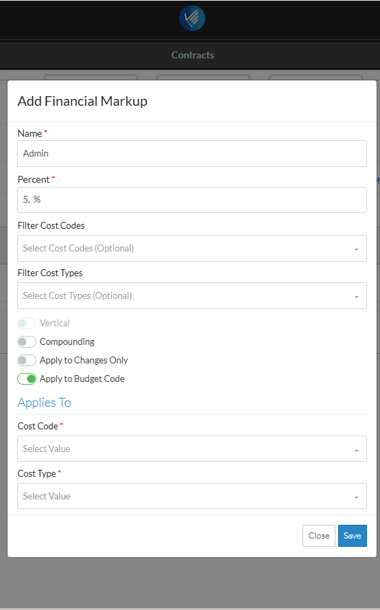 - From the Add/Edit Financial Markup Form, when Apply to Budget Code is turned on, click in the Cost Code drop down.