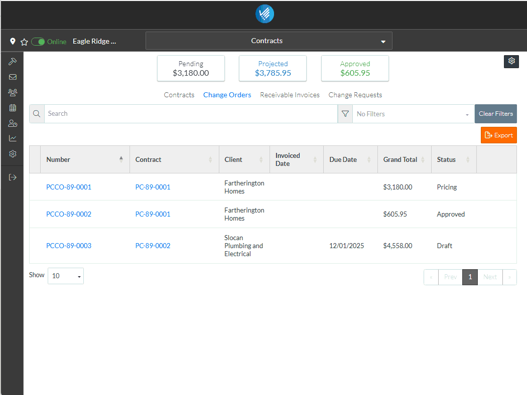 - Edit or View the Change Order by hovering on the Change Order row and click on the View