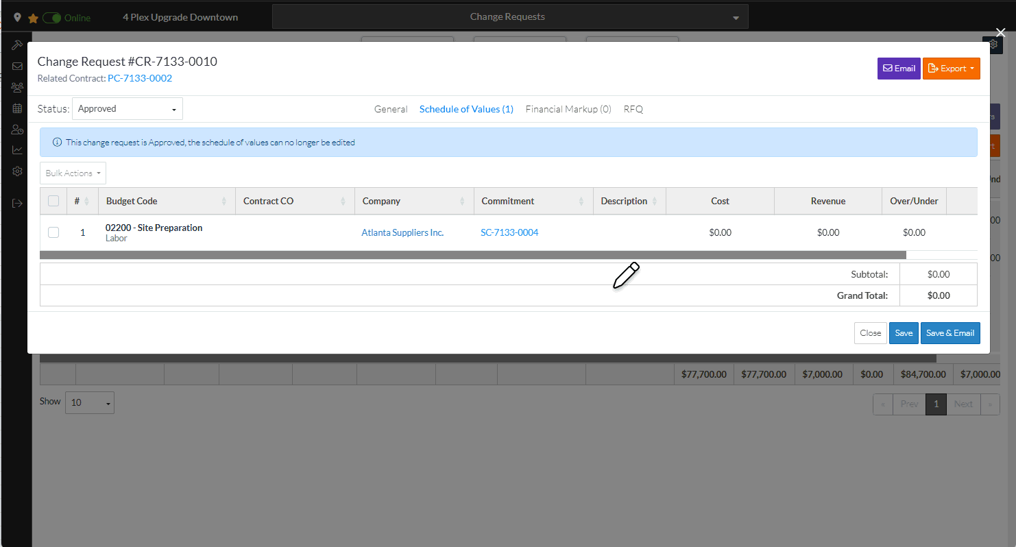 - Whether the Line Item on the Change Request Schedule of Values has been associated with a Line Item on a Commitment or Commitment Change Order Schedule of Values.