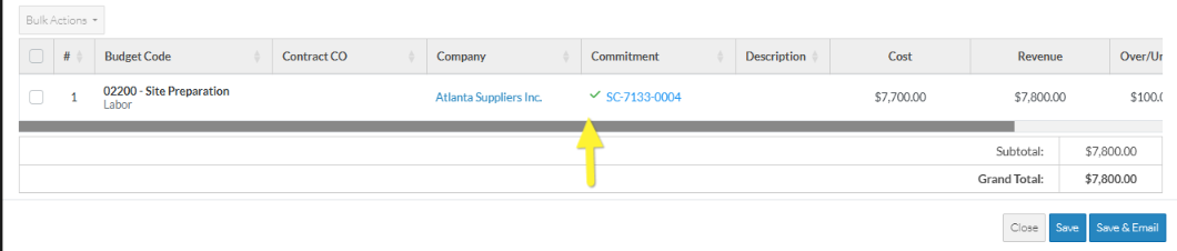 If the Commitment or Commitment Change Order does not have a check mark, it means it is associated with the Commitment or Commitment Change Order but has not been created as a Line Item on its Schedule of Values.