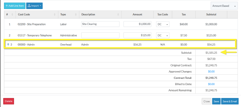 Line Item #3 - Amount = total of the Markup Values = $50.00 + $6.25 = $56.25