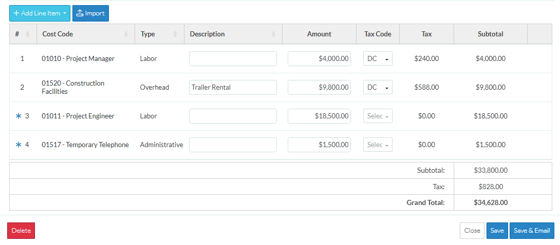 If the Line Item was not added from a Change Order (i.e. there is no blue asterisk next to the Line Item #), the row is deleted and the totals are updated to reflect the change. However, the deletion isn't saved until the entire Contract Change Order is saved.