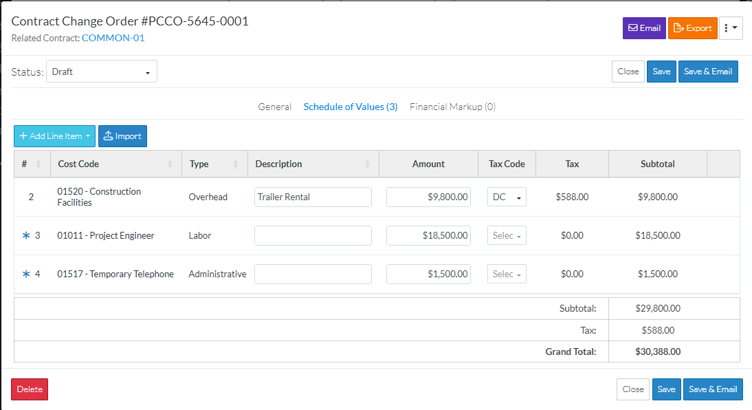 To bulk Import Line Items, see Contract Change Order - Schedule of Values - Import.