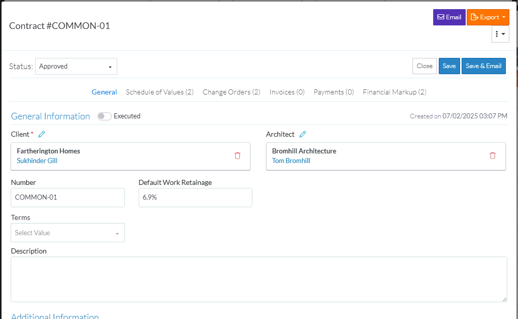 To view or edit an existing Contract (including settings up Schedule of Values, adding change orders, creating and tracking Invoices and Payments or settings the Financial Markups), see Contracts - View/Edit.