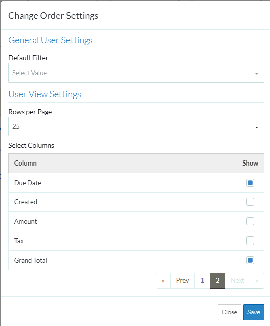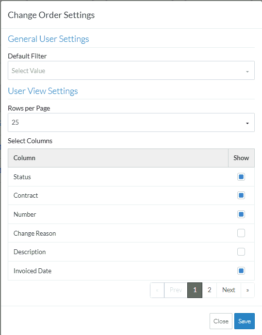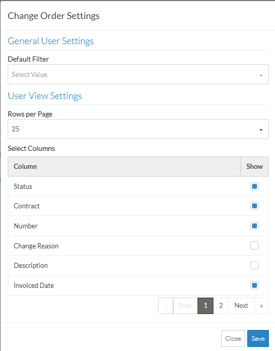 - To change the default number of Rows to display per page, see Contracts - List of All Change Orders - Settings - Rows per Page.