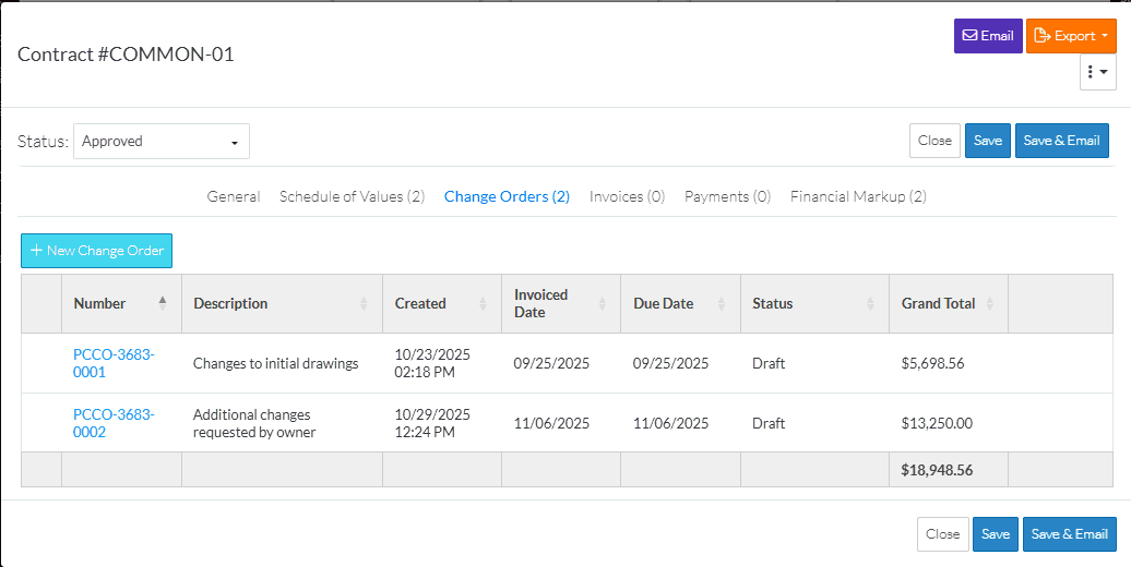 New Contract Change Orders can not be added from here. They can only be added from the specific Contract, see Contract Specific Change Orders List - Overview.