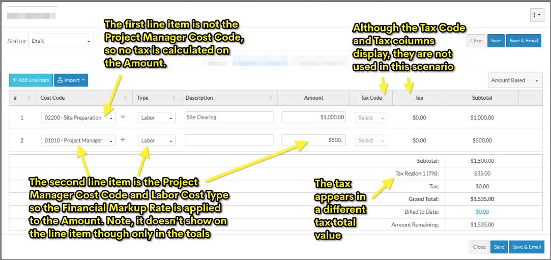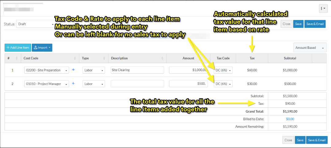 To setup taxes for each individual Schedule of Values and to automatically apply on Line Items, see Financial Markup.