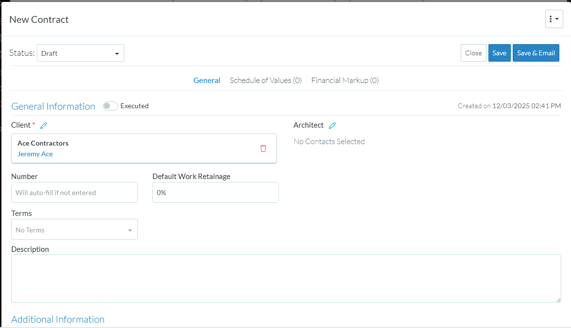 The New Contract form displays. See Contract – New - Form Layout and Navigation for more information.