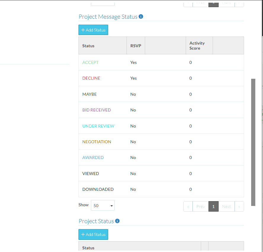 When a Contact is assigned as a Bidding Participant, they will be assigned an Activity Score that is obtained from the Settings - Projects - Project Message Status. The Activity Score assigned depends on the status and the actions taken so far. Basically, the farther along in the process the Status is, the higher the Activity Score should be. The Activity Score is not cumulative, it is just set to the value from the list based on the status set and actions taken. See Settings - Projects - Project Message Status - Activity Score (Examples) for more details.